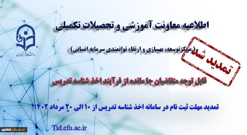 امتیاز دهید : تمدید مهلت ثبت نام متقاضیان جامانده از فرایند اخذ شناسه تدریس 2 سهشنبه 10 مرداد 1402 ساعت 7:20